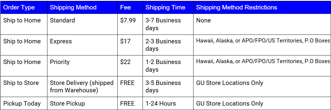 GU has now expanded shipping services to military and U.S. territories with standard shipping, including American Samoa; Guam; Northern Mariana Islands; Puerto Rico; U.S. Virgin Islands; and Armed Forces Americas, Europe, and Pacific.